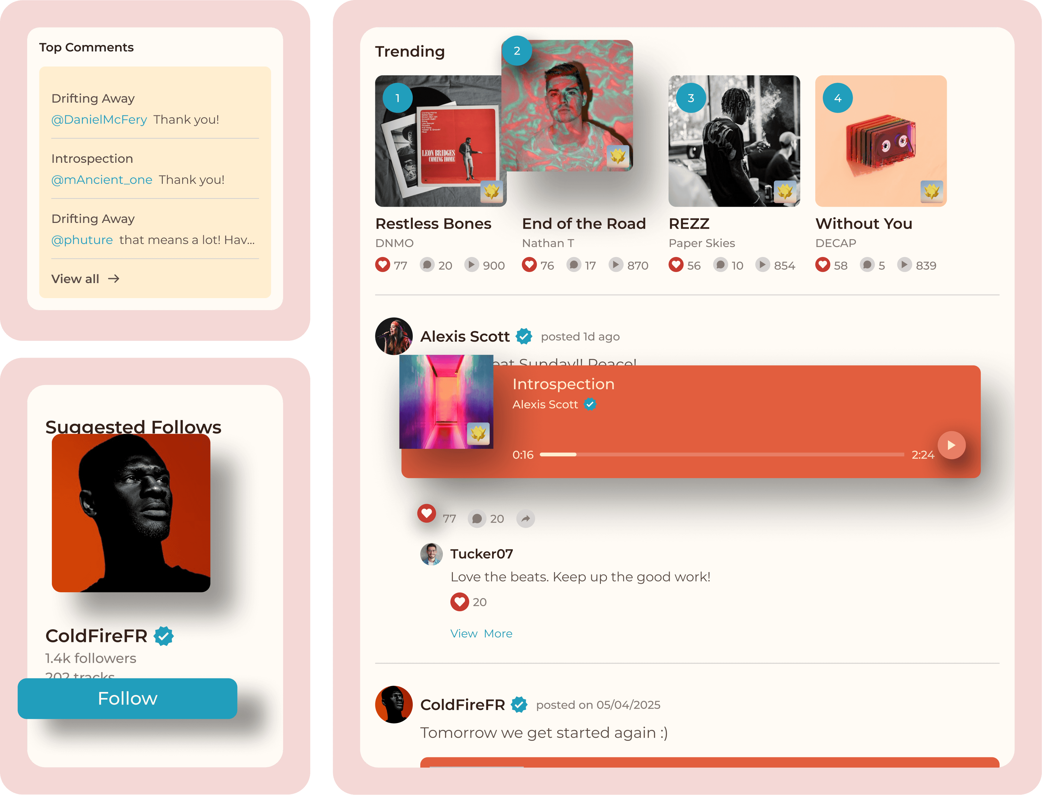 High-quality audio playback paired with likes, comments, follows, shares, and activity feeds to drive engagement.